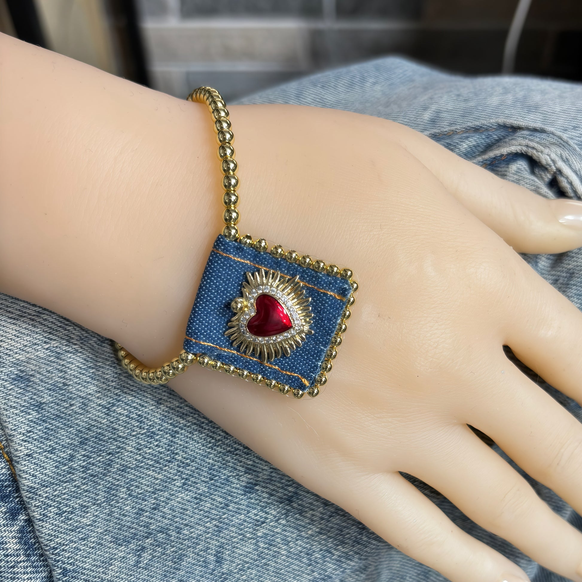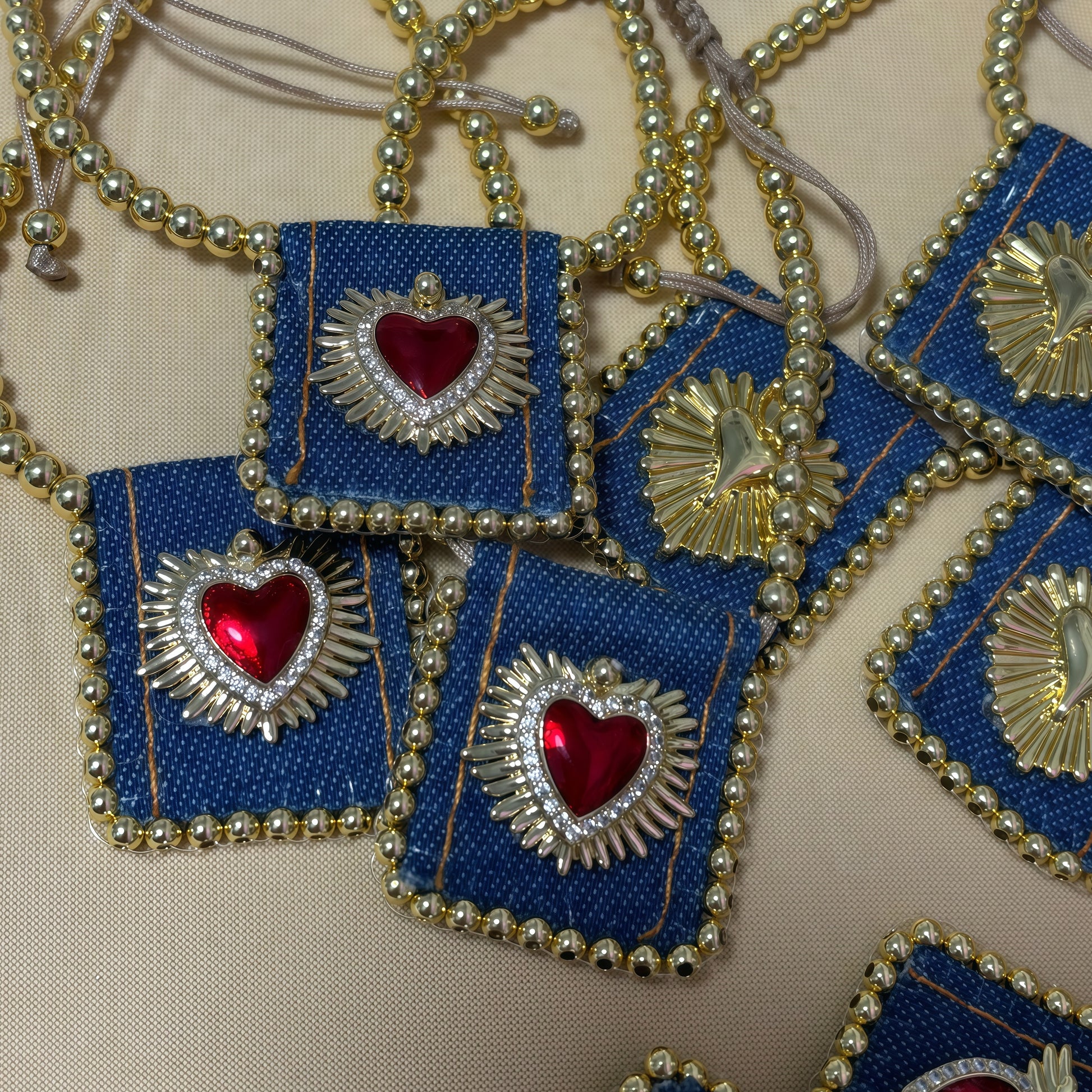 Dare to make a statement with the Cooper Vintage Scapulary Bracelet—a bold fusion of spiritual symbolism and contemporary edge. This adjustable denim piece features a striking red heart pendant that commands attention, blending timeless devotion with modern attitude. Perfect for layering or wearing solo, it's the accessory that says you're fearless enough to honor tradition on your own terms. Trending now for those who refuse to play it safe.