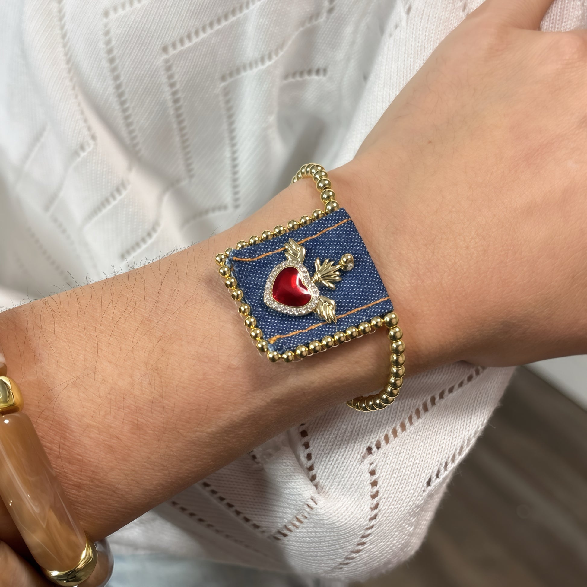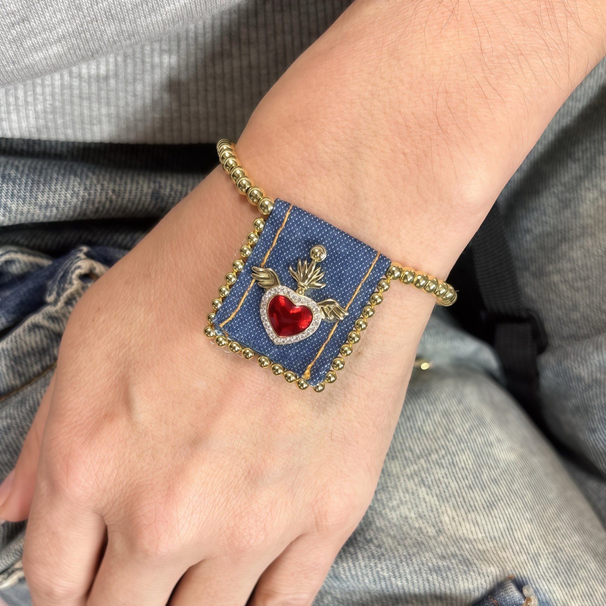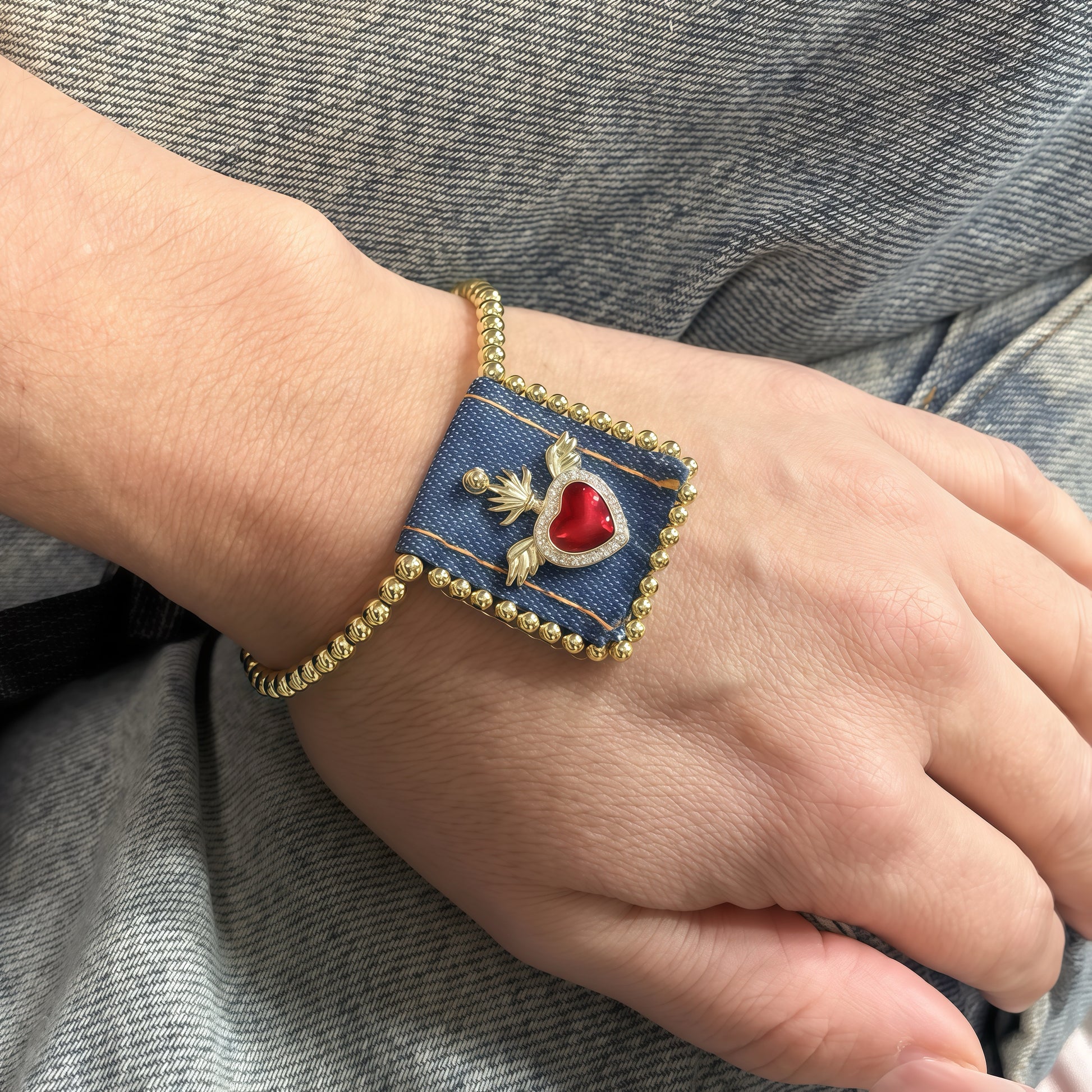 Dare to make a statement with the Cooper Vintage Scapulary Bracelet—a bold fusion of spiritual symbolism and contemporary edge. This adjustable denim piece features a striking red heart pendant that commands attention, blending timeless devotion with modern attitude. Perfect for layering or wearing solo, it's the accessory that says you're fearless enough to honor tradition on your own terms. Trending now for those who refuse to play it safe.